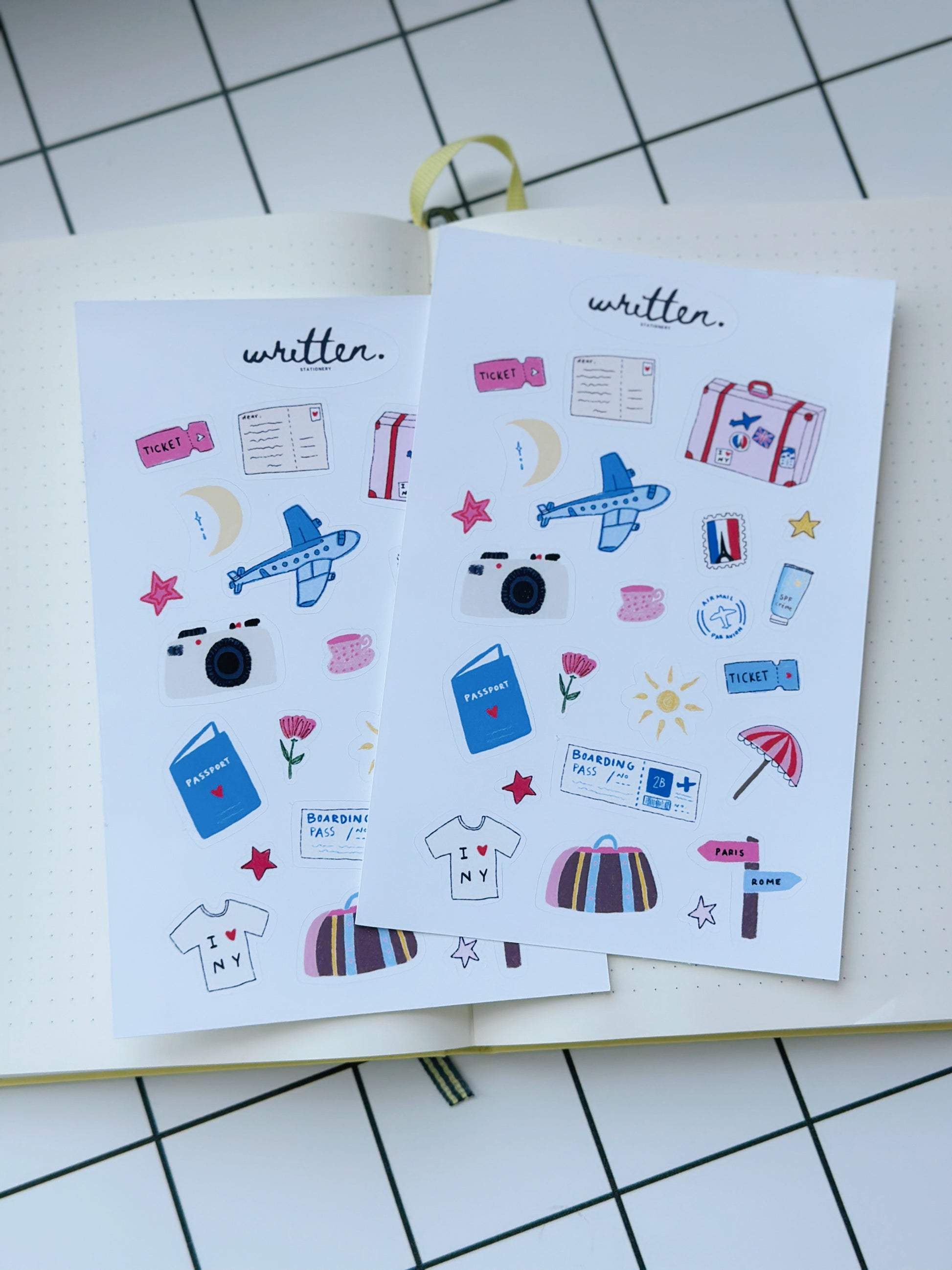 Jet-set in style with our Travel-Themed Sticker Sheet Pack, perfect for planners, scrapbooks, and crafting your next adventure! Each sheet is packed with charming travel icons like airplanes, passports, boarding passes, tickets, postcards, luggage, cameras, and destination signs.